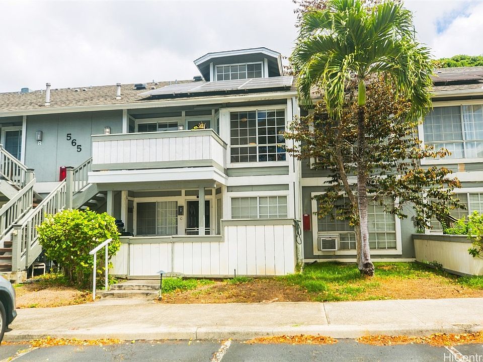 Upstairs loft style 2 bedrooms, 2 bath, 2 assigned parking townhouse located in the 24-hour secured and gated community of Crosspointe. This desirable unit has 12 SELLER OWNED PV panels, SPLIT A/C and ceiling fans which will provide much comfort with minimal utility costs. Enjoy the natural lighting throughout or roll down blinds for privacy. The modern kitchen offers granite counter tops, farmers sink, stainless steel appliances and plenty of cabinet storage. Both parking stalls are located close to the unit along with guest parking until 2 a.m. A walking path leads to resort-like amenities including fitness center, pool, jacuzzi, recreation room, sand volleyball court, BBQ area, EV Chargers, children's playground, car wash area and resident manager. Spectrum Basic cable (internet speed up to 1Gig) is included in HOA fees. This community is conveniently located to freeway entrances, Pearl Ridge Shopping Center, restaurants, airport, Aloha Stadium and Pearl Harbor. To be sold in AS IS condition.