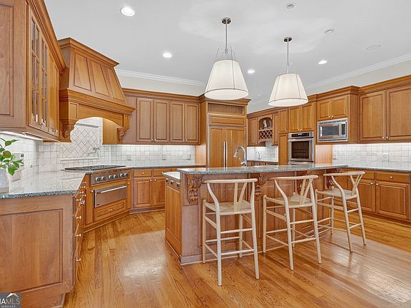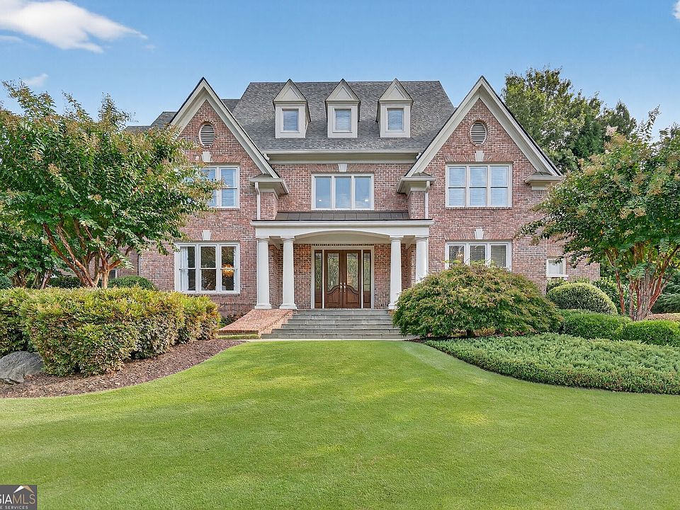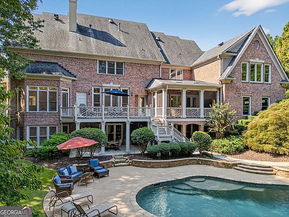 Experience resort-style living in this elegant estate on a private cul-de-sac in the highly sought-after community Winfield on the River, a one-of-a-kind gated neighborhood nestled on the serene banks of the Chattahoochee River. With its timeless brick architecture and natural landscaping, this home is a special retreat with luxurious amenities and exceptional indoor-outdoor living on +/- 0.70 acres. Step inside to a grand two-story foyer flanked by a formal dining room and a flexible office/library/den space-perfect for both elegant entertaining and everyday living. The expansive ceilings and wall of windows in the family room flood the space with natural light, while the open-concept layout flows seamlessly into the gourmet kitchen, complete with high-end appliances, abundant cabinetry, and an entertainer's island. Just off the kitchen, a spacious screened porch and deck overlook your private and spacious backyard oasis. Outside, your own backyard paradise awaits, featuring a stunning saltwater pool with a waterfall, framed by lush, manicured landscaping for maximum privacy and relaxation. The main level owner's suite is a peaceful retreat with a spa-like ensuite and serene views. Upstairs are three spacious bedrooms, three bathrooms, and a versatile bonus room-ideal for a playroom, teen suite, or additional living space. A large unfinished space with a private entry also has the potential to be an additional private suite for guests or multigenerational living. The daylight terrace level is a versatile space for everyday entertainment or hosting guests, offering a full pool bath, tiled playroom with closet, expansive rec room, gym, private office or 5th bedroom with full bath, fireside family room with wet bar, workshop, and extensive storage. Off the terrace level is an additional large covered patio space. Bordering a beautiful river across from a national park with recreation space and hiking trails, the neighborhood feels private and secluded, yet boasts proximity to premier shopping and dining at The Forum and top-rated public and private schools, including Johns Creek High School, Autrey Mill Middle School, Medlock Bridge Elementary School, Perimeter Christian School, and the Wesleyan School. The Atlanta Athletic Club is just minutes away. This home truly combines classic elegance with modern luxury in one of Johns Creek's most desirable gated communities.