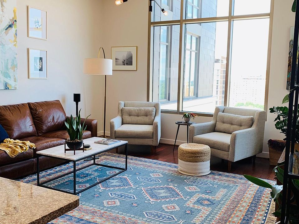 VIDEO TOUR AVAILABLE. SEND MESSAGE TO RECEIVE. This stunning Midtown Condo is located in a Great location right on Peachtree St on the Penthouse Level, 1 block south of the infamous Fox Theater. It's also one of the biggest (if not the biggest) 1b drm + den + 1 bathrm you'll find in the area. -Walk to: Piedmont Park, Fox Theater, Mercedes Benz Stadium (where Falcons & Atlanta United play), Phillips Arena, Aquarium, Centennial Park, Ponce City Market, Beltline, Tabernacle Concert Hall, Marta subway, Post Office, Supermarket, pharmacy, coffee shops/restaurants, Georgia Tech, Georgia State University, Bank of America Building, and more! -Driving: The building is located on the corner of Peachtree St and Linden Ave. Linden Ave turns into on-ramp for 75/85 three blocks west of building. Easy access to downtown, midtown, Buckhead, highways, etc Condo Features: Located on Penthouse level - 17th floor, 12' ceilings, Large Balcony w/ custom screen door, Custom iron/glass French doors for office/den/guest bedroom, Spectacular view of Midtown and Fox Theater, Piedmont Park, as well as Stone Mountain to the east, and beautiful sunrises, Extremely quiet floor with great neighbors! Only 7 other people live on the floor & building is very inconspicuous from the street, lending privacy, Newly renovated bathroom New HVAC system, New Washer/Dryer included Freshly painted, 1 assigned parking spot located on 4th floor in garage under building, (**Extra parking spots available for rent) Google Fiber for Internet/TV, 24 hr concierge, Salt water heated pool/grills/workout room/club room located on 7th floor, Pickup dry cleaning service, Renter is responsible for Background Check fee of $45. Move-in fee is also applicable and the responsibility of the renter according to the Reynolds HOA policy Extended lease terms available