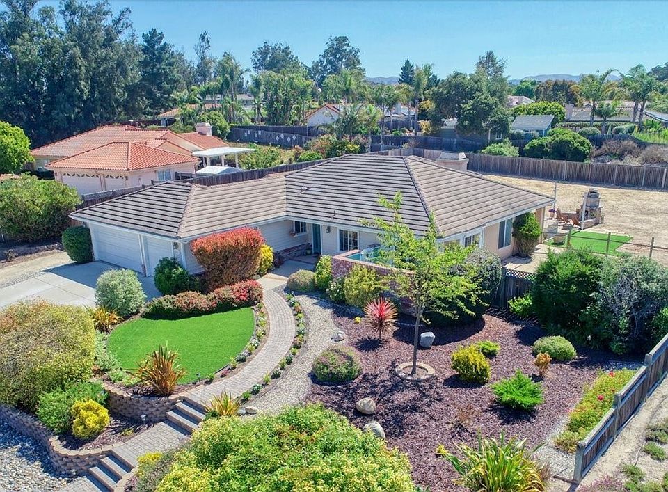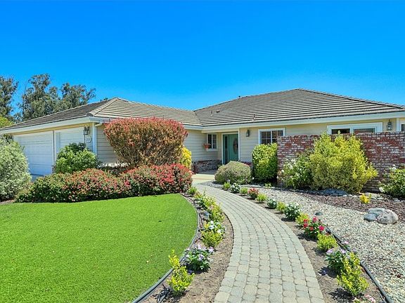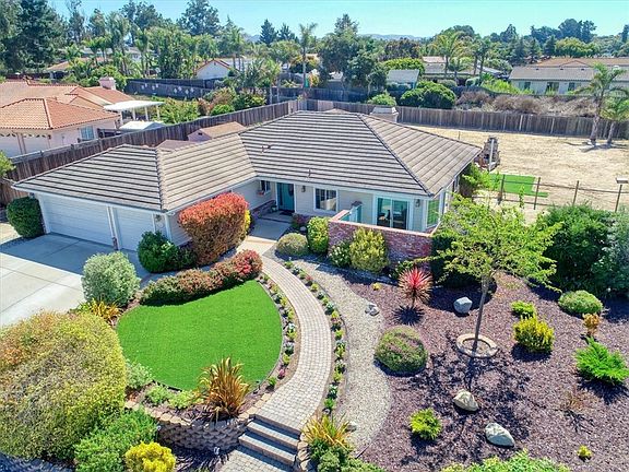 Great single level move-in ready 4 bedroom Greg Nester home. Quiet and highly regarded cul de sac neighborhood. Extensive front yard landscaping. Welcoming floor plan with quality updated finishes. The home features hard surface floors throughout. Kitchen has quartz countertops, kitchen island and stainless steel appliances. Dining room has French doors that open to the outside patio and into the living room with a gas fireplace. The master bedroom has a large walk in closet and a second closet with mirrored doors. Both bathrooms feature private waterclosets and the master bath has both a soaker tub and a walk in shower. The third garage space was converted by the builder into a permitted 4th bedroom. There is a fully fenced turf lined dog kennel in the side yard. Sideyard has two large storage sheds and can be used for RV parking. The backyard has outside patio with a freestanding wood burning fireplace. Patio is designed with concrete and pavers and is perfect for entertaining. Large backyard will accomodate your choice of gardens/orchards, swimming pool and/or sports activities. Great location close to the beach and other Central Coast destinations.