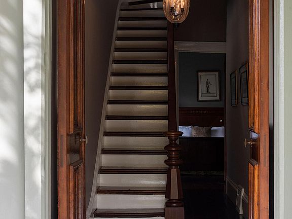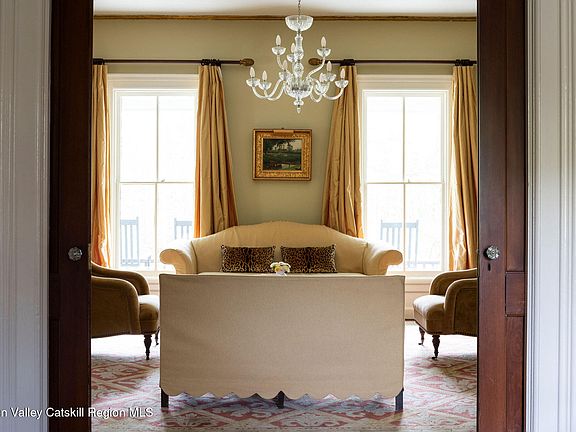 Introducing Knickerbocker Farm, an elegant circa 1790 farmhouse overlooking rolling meadows, a tranquil pond, and two antique barns, on over 12 acres, just three miles from the heart of Rhinebeck. Enter through the classic front hall with its graceful staircase and sense of history. The living, dining, and sitting rooms are graciously proportioned, each featuring 10-foot ceilings, decorative crown and base moldings, marble fireplaces, and beautifully preserved wide-board floors that flow throughout the home. Pocket doors connect the living room and sitting rooms, adding both charm and flexibility. Sunlight pours into the corner sunroom from the east and south, while the eat-in kitchen, anchored by a striking stone fireplace, offers a warm gathering space for casual dining. French doors open to a mahogany back deck, perfect for enjoying the sweeping pastoral views. A first-floor bedroom and full bath allow for guest accommodations or one-level living. Upstairs, four sunlit bedrooms include two spacious rooms, a cozy smaller bedroom, and one tucked away in its own wing, as well as two full baths. A full walk-up attic provides generous storage. The stately front porch spans the home's façade, inviting quiet moments of relaxation and connection to the landscape. Knickerbocker Farm is both enchanting and timeless - elegantly designed yet comfortably to live in, with thoughtful details and sweet nooks throughout. A true Hudson Valley treasure.