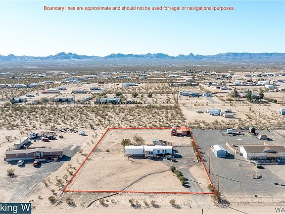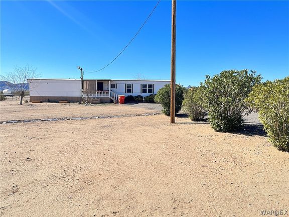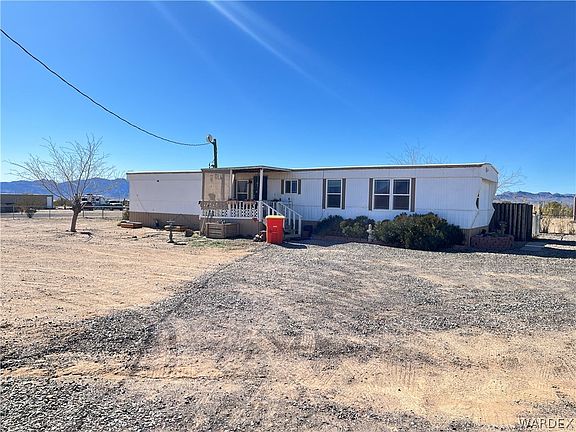 This two bedroom, two bathroom home is situated on a spacious 1.1 acre, fully fenced lot just steps from the paved road. This warm and inviting home has a lot of great updates, including a new air conditioner installed in 2022, newer windows throughout, a new stove and dryer in 2022, a new tub in the guest bathroom and stainless steel appliances. Enjoy the summer breeze with the French doors leading out to a small deck, with a small vinyl lined pool below it. Benefit from the newer windows for added energy efficiency. The fully fenced yard includes 6ft chainlink along the front of the home, 4ft fencing along the side and rear and a wood fenced in area in the rear of the home for additional privacy. Two double drive thru gates offer plenty of parking and space for your RV. This property includes so much storage with 3 large storage sheds, a Conex container and a small tool shed. Just 22 minutes from Bullhead City/Laughlin where you can enjoy the beautiful Colorado River or Lake Mohave. With so many great features, this home is sure to be a wonderful place to call "home".