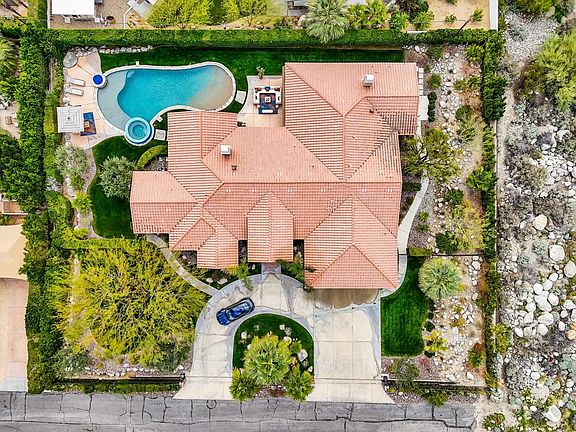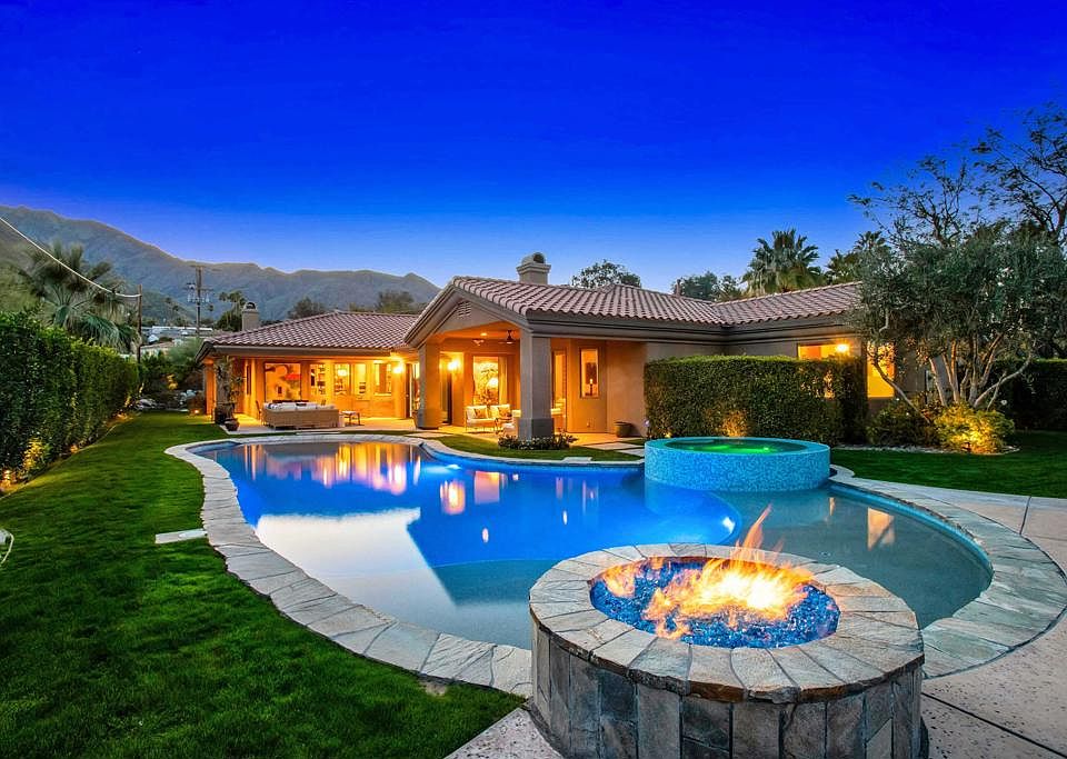 Little Tuscany, btw Old Las Palmas and Desert Palisades, merges affluence, serene landscapes + architectural gems. Nestled at the end of a cul-de-sac, this estate blends splendor, warmth, & elegance. The oversize lot, the circular driveway, the wrought gates, the majestic entrance + the foyer set the tone for this striking elegant estate. This extensively renovated & environmentally efficient home features an open layout, perfect for entertainment & relaxation. The living room boasts a fireplace, vanishing sliding doors, blending indoor splendor w/outdoor calm. A cozy fireplace frames the exquisite family room. A classic & modern updated chef's kitchen w/high-end appliances & a large island foster an environment for gatherings. A breakfast nook + a lavish dining area provide ample space for entertainment. With 5BD/4.5BA, it provides ample guest space. The East wing contains a posh BD En-suite w/a fireplace, large walk-in closet, a deluxe bath, plus an extra BD. The West wing has a casita, a junior suite, + another BD, offering privacy & comfort for all parties. It features a large pool w/a beach-like ramp, spa, firepit, framed by stunning Mtn views & a premium south-facing orientation. Various entertainment spots, including an al fresco dining area, sit in a lush, green yard, beautifully contrasting w/the pool's blue. At night, the sky becomes a vast canvas, adorned by shooting stars. The home epitomizes luxury, sophistication + tranquility in the desert's heart. Land owned.