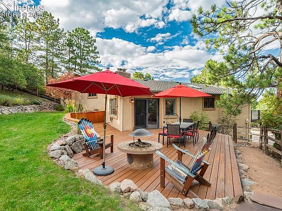 The One for Character. The prize of the 1976 Parade of Homes, elemental living abounds with a prow living room and sliders opening onto a full-span front deck with city light views. This five bedroom, 3 bath, 4-car garage home with 3400+ square feet on a 0.42 acre lot is brilliantly-positioned for life with large rooms, perfect outdoor living areas, updated bathrooms, and a spacious granite & maple kitchen. But this is just the beginning. Vaulted tongue-and-groove ceilings highlight the main level, where hardwood flooring extends through the entry, dining, kitchen, and family room. A full-wall moss rock fireplace and beamed ceilings bring warmth and distinction to the living room, complemented by an expansive rear deck of over 300 square feet overlooking forested hillside open space. The backyard offers just enough grass, a gas fireplace and grill line, and a fenced garden area. The island kitchen showcases rough-hewn granite slab counters, maple cabinetry, stainless steel Bosch and GE appliances, and a new tile backsplash. Upstairs, engineered hickory flooring connects three spacious bedrooms. The primary suite includes a walk-in closet, wooded views, double vanities with granite counters, and a spa-like tiled shower with bench and hand wand. A remodeled full bath serves the secondary bedrooms. On the lower level, another family room with LVT flooring, built-ins, and a second moss rock fireplace creates inviting flex space. Two additional bedrooms, a remodeled ¾ bath, and laundry complete the level. An oversized garage spans 37 x 40 feet for cars, storage, or workshop needs. With two furnaces, dual A/C units, Nest thermostats, and a location within casual Discovery at Rockrimmon, this home is minutes to Rockrimmon Elementary, local parks, and quick access to the United States Air Force Academy and downtown Colorado Springs. Your Comfortable Paradise Awaits.