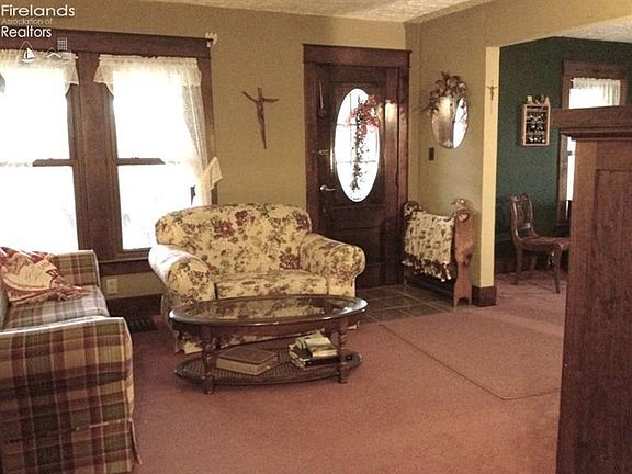 Inviting front porch leads to 3-4 bedroom, 1.5 bath home on peaceful 5.5 acres with stocked pond & 6 other buildings with electric. 1590 sqft. Newer wood floors in large open country kitchen with breakfast nook overlooking backyard with pond, fields and trees. Formal dining room with beautiful natural woodwork & glass built-ins. 3-season sunroom with French doors off living room. Front parlor has woodburner with marble hearth for additional heating option. Full bath with jetted tub adjacent to first floor bedroom. Hardwood floors under carpet. Conveniences like newer central A/C, forced air furnace & public water. Roof new 2008. Updated panel box. Most of home rewired. Newer windows throughout. Secondary living quarters next door with separate electric great for in-law suite. 32x60 6-stall barn with 32x24 addition. 24x32 garage with loft, 220-line, woodburner & newer door with opener. 3 other outbuildings. About 2.5 acres of woods with creek. Pond stocked with Bluegill, Bass & Catfish.