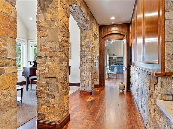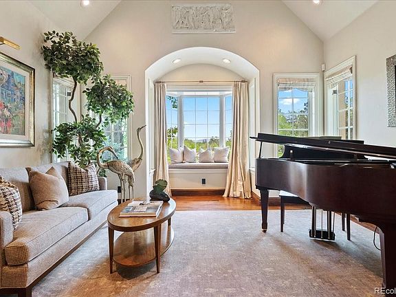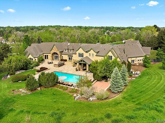 Classic European-inspired residence offers an impressive street presence combined with unparalleled privacy. On over 2 beautiful acres of property, where life, space, and functionality blend harmoniously against a backdrop of sensational mountain views. A circular drive welcomes you to this home, featuring exceptional architecture, superb craftsmanship + an unrivaled level of luxury. Inside, spacious & elegant principal rooms are ideal for entertaining with high ceilings, hardwood floors, wood-paneled walls, stone accents, custom built-ins, slab granite & marble, adding to the all-encompassing grandeur. Sunlight streams into the open interior, showcasing an inviting stone-clad foyer, gourmet kitchen by William Ohs with island, breakfast bar, dining area, servery & pantry. High-end appliances include built-in Miele coffee bar, Wolf gas cooktop & double ovens + SubZero refrigerator. Adjoining great room with stone fireplace & French doors leads to the patio & pool. Private main level primary suite includes fireplace, spa-like 5pc bath, walk-in closet + serene balcony. Handsome walnut library, 2nd bedroom en suite, large laundry & mudroom + 2 powder rooms are also on the 1st floor. Three additional en suites complete the upstairs level. Equipped for endless entertaining, the walk-out level consists of family room with handsome bar, wine cellar & stone fireplace + theatre, gym, powder room & 6th en suite with 3/4 bath including steam shower. Complete with bonus/flex/bedroom above the 5-car garage, this property offers a range of grand & intimate gathering spaces. Designed for exceptional Colorado indoor/outdoor living, the expansive back patio with outdoor kitchen, fireplace & swimming pool, is ideal for lounging & relaxation. As an added benefit, the property has 2 secluded & owned solar arrays that produce approx. 3000 kw/h per month of electricity. Near the High Line Canal Trail & Little Dry Creek, this property is a true oasis in the heart of Greenwood Village.