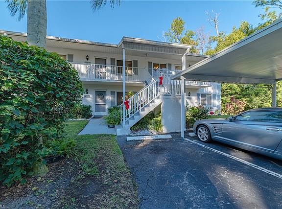 Lovely 2 bedroom 2 bath end unit with volume ceilings, covered carport and screened lanai. This unit features wood flooring in the living areas with carpet and tile in the bedrooms. The eat in kitchen has white cabinetry with pass through to the living/dining area. The screened lanai overlooks the pool area and beautiful landscaped grounds. New washer and dryer, new hot water heater in 2017, new AC 2014 and new faucet and garbage disposal. Property is conveniently located close to downtown Naples shopping and dining.
