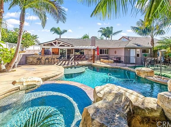 Unique expanded home with a resort-style backyard! Prime location! The Bolsa Chica Wetland walking trails are just outside of the neighborhood. Bike the beach, hike the Brightwater Trails, or enjoy a day in the oasis-like pool and spa. This one-of-a-kind home invites you to stay awhile. Comfortable, clean, and super spacious. The spotless kitchen is light and bright and open to the living room. The backyard has an additional kitchen and food prep area; built-in BBQ, gas burners, refrigerator, overhead light, heater, and a gorgeous wood overhead. The sliding door in the kitchen area opens to the fantastic pool/spa area. There are four bedrooms and two bathrooms. The master suite features an oversized shower, a soaking tub, and a huge vanity area. Two cedar-lined walk-in closets in the master bedroom give you plenty of wardrobe space. The quiet, pristine neighborhood is safe and comfortable, the perfect place to raise a family.