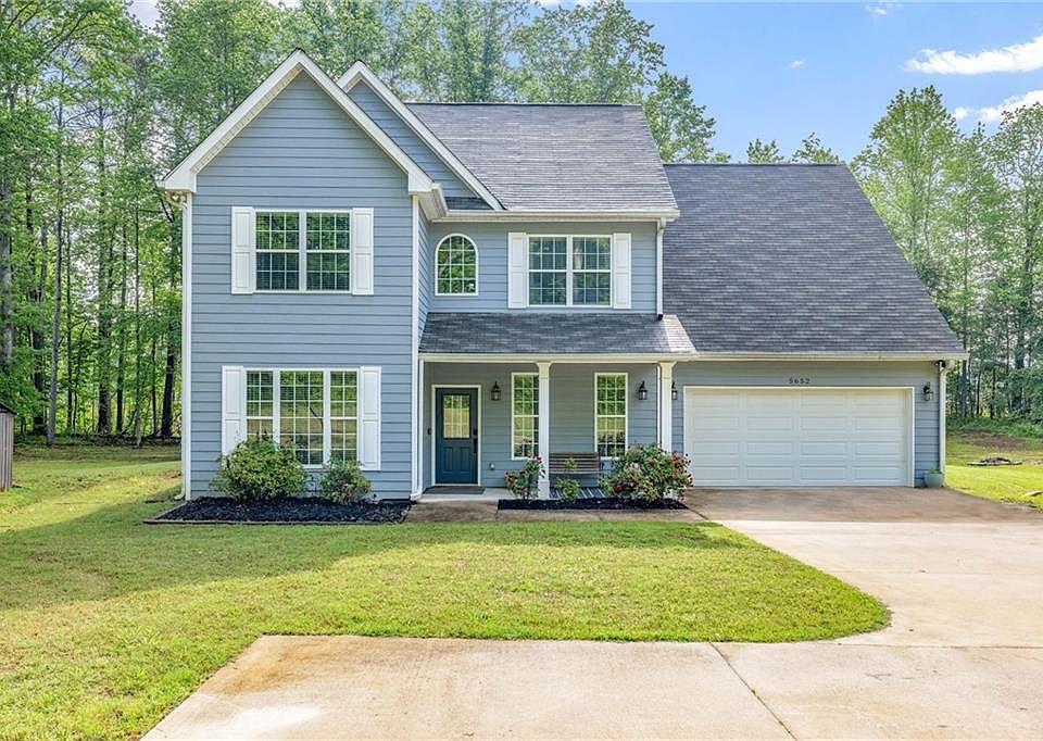 Peaceful, farmhouse living on almost 2 acres of land surrounded by mature woods. You'll love the covered front porch! Beautiful, modern interior with two-story formal entry. As you enter the home, you will see a living room/office space, a dining room, a small mudroom, and a tasteful half-bathroom. The great room beyond features a wood-burning fireplace and is open to a beautiful kitchen and breakfast area with white, soft-close cabinets, stainless steel appliances, gorgeous backsplash, and granite counters. The large kitchen island provides additional eating space. Direct exit and access to the oversized garage and backyard, with a large patio. Mature fruit trees on the property. Upstairs, the main bedroom is oversized and has an en suite bathroom with a large tiled shower, a soaking tub, and ample cabinet storage. The central walk-in closet has a built-in closet system. The secondary bedrooms are large and have plenty of closet space. The bonus room upstairs is perfect for a playroom or exercise area. The entire lot has wire fencing at the perimeter, a private water well, and a septic system. Excellent North Forsyth HS and feeder schools, close to Hwy 400, the Dawsonville Outlet Mall, shopping, and the new Coal Mountain Town Center.