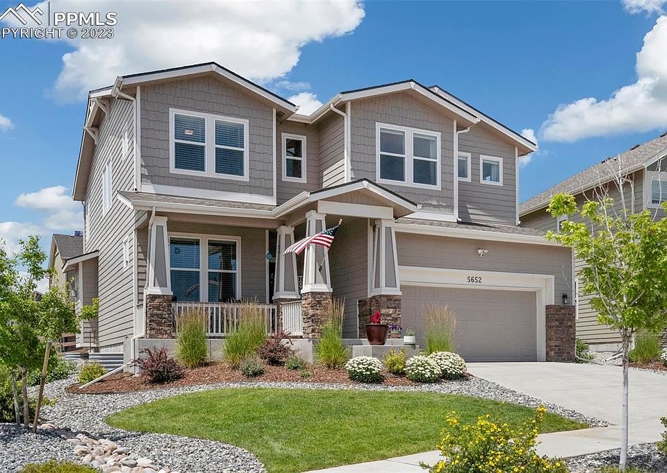 Welcome home to one of the most desirable floor plans in Wolf Ranch! This charming craftsmen-style house with a cozy front porch will make you feel at home as soon as you pull up! You will find newer laminate wood floors on the first two levels. There is an office, or sitting area right off the front door, a spacious custom mudroom with ample storage, leading to a two-story great room with many windows and natural light. A custom gourmet kitchen with stainless steel appliances, gas cooktop, granite countertops, custom backsplash, island, large pantry, and butler's pantry make for a perfect place to entertain. The large eat-in area off the kitchen is open to the backyard, perfect for grilling, enjoying the fire pit, or relaxing. Upstairs you will notice an extra-wide staircase leading you up to a loft overlooking the great room along with windows perfectly framing Pikes Peak. You will love the space in the Primary suite, complete with a 5-piece bath with under mount sinks, granite countertops, a large shower, and a spacious closet. Two more bedrooms, a full bath, and a laundry room round out this space. The basement is all brand new, just finished. Lots of room to spread out and enjoy! Two additional bedrooms with good size closets, charming new bath with custom vanity, family room, and lots of additional storage complete the basement. This home has so much to offer and many upgrades that you must see to appreciate. New light fixtures throughout, all baths have under mount sinks, all bedrooms wired for ceiling fans, an iron staircase, remote shades in the family room, 9 foot + ceilings throughout, fully landscaped yard, to name a few. Close to parks, schools, shopping, hiking trails, the neighborhood pool, shopping and more! This D-20 home won't last long, it might just be what you have been waiting for!