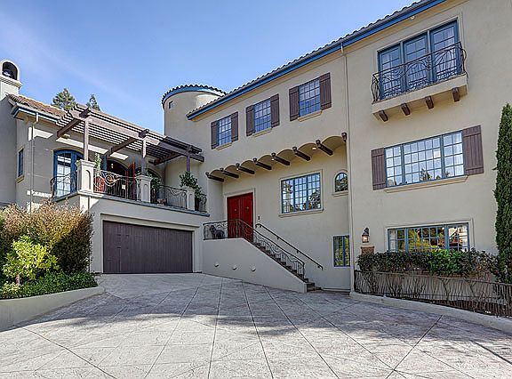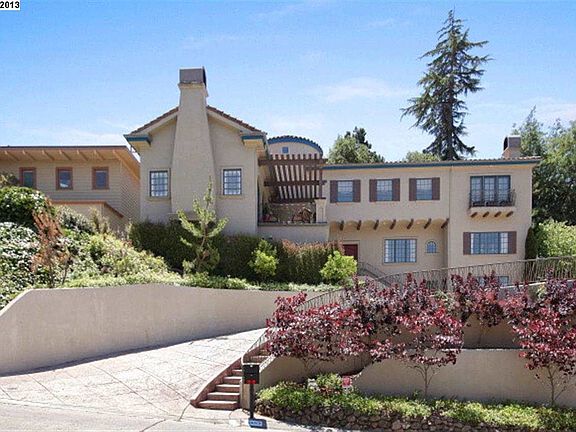 Dramatic Mediterranean, Piedmont side of Montclair. Architectural details, soaring ceilings, distinctive iron work, expansive proportions, comfortable flowing floor plan, custom French doors access patios & verandas. Filtered Bay & San Francisco views. Rejuvenated Inside!