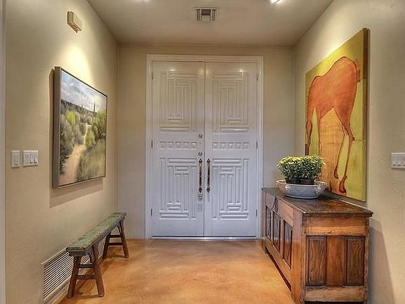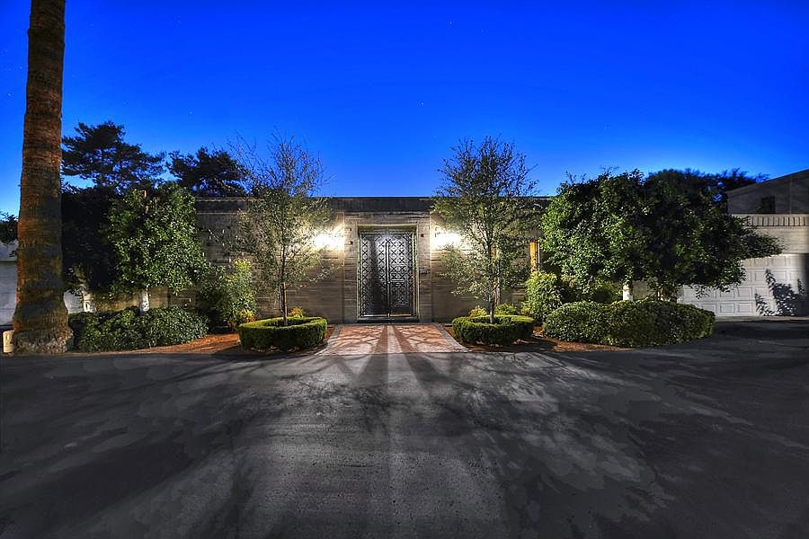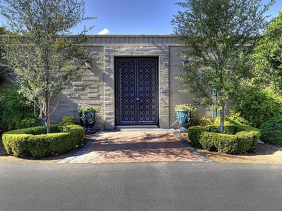 Richly glazed Anduze pots filled with flowers flank the iron-gated entrance into this very private, urban townhouse w/ 10ft floor-to-ceiling glass walls surrounded by lush landscaping, a ''lionhead'' fountain, garden murals, a stone fireplace, and lots of patio spaces. Extensively renovated from top to bottom in 2004, the floor plan features an eat-in kitchen open to the 19 x 30 ft greatroom w/fireplace, 2 large master bedrooms--one w/ a fireplace, the other w/ a sitting area, & a book-filled library/office w/ its own walk-in closet & full bath. Beautiful lightly distressed alder wood cabinetry, concrete floors, slab noche travertine counters and Hans Grohe fixtures all contribute to the eclectic feel of this unique, one-of-a-kind ''glass house'' in a prime Scottsdale location.