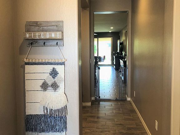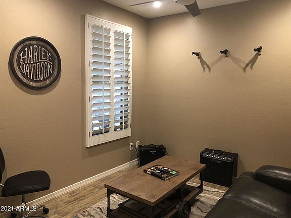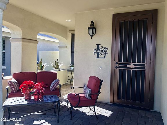 Welcome to Encore, an amenity filled 55+active adult community. Home has many outstanding features including , 2' garage/front porch extension,12' multi-slide door opening the view to the lush backyard, 2' rear patio extension w/built-in gas fireplace & wired for TV. Patio is equipped w/metal motor driven shutters. There's a 2' bump out to expand the Master bedroom. All windows have sunscreens/plantation shutters. You will not see it, but garage walls are insulated as well as ceilings of all non-livable areas. No waiting for hot water to reach Master bath, thanks to the recirculating pump. Extra recessed cans t/o, ceiling fans t/o, 3 TV pre-wires, garage has 3 LED fixtures. Tile floor t/o, Opt. base/upper cabinet off kitchen/laundry-Kitchen granite Furniture/TVs avail on sep. bill of sale