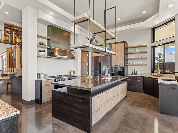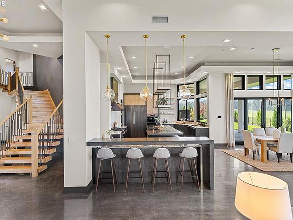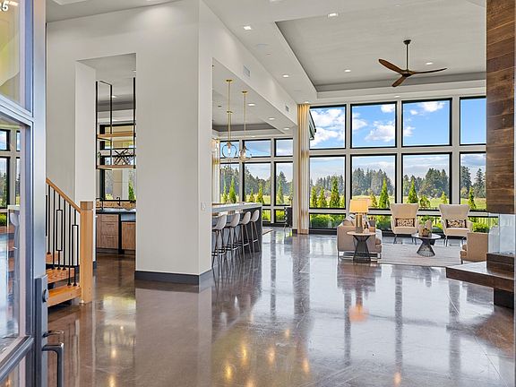 A custom Street of Dreams estate on The Reserve Golf Course, 5652 SE McInnis Street showcases modern design and exceptional craftsmanship throughout. Inspired by Frank Lloyd Wright, the home blends sleek architectural lines with natural materials for a timeless and inviting feel.The main floor features Lochnivar heated concrete floors and floor-to-ceiling windows with remote shades and draperies that frame stunning golf course views year-round. The open kitchen, dining, and living areas flow seamlessly into the covered outdoor patio with a gas fireplace and built-in DCS grill with range hood, perfect for both casual and formal gatherings. Highlights include vaulted ceilings, a frameless corner fireplace, and natural stone counters at the kitchen island and bar. The main level also offers a guest suite, office with built-ins, half bath, gym with A/C and French doors to the lawn, and the primary suite with French doors to the backyard, a soaking tub with views, a walk-in shower, and an extraordinary walk-in closet.Upstairs, a floating staircase leads to a loft with a custom reading nook, dual desk spaces, and built-ins, plus two additional bedroom suites with walk-in closets. The bonus room, complete with wet bar, full bath, and custom shelving, is ideal for a media room, additional bedroom, or hangout space.The front courtyard is framed by dramatic columns and serene water features, while the level backyard backs to the 12th fairway of The Reserve Vineyard & Golf Club. Just blocks away, enjoy neighborhood pool and clubhouse amenities. Conveniently located about 10 minutes from Nike and Intel. [Home Energy Score = 1. HES Report at https://rpt.greenbuildingregistry.com/hes/OR10212516]