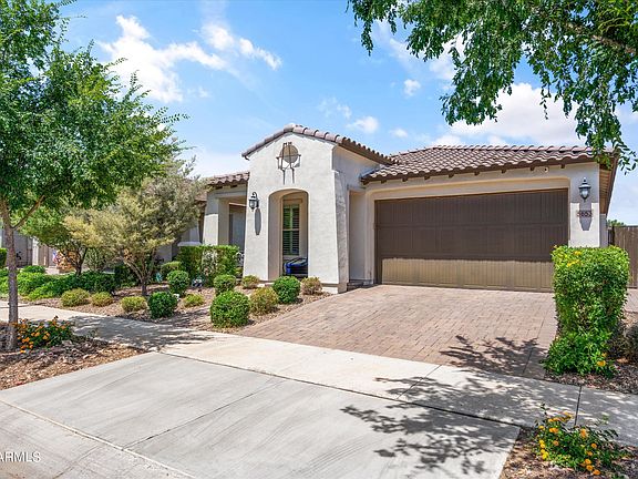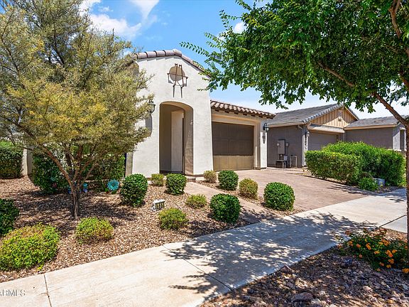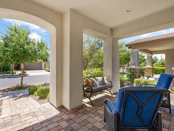 Welcome to this charming home located in Encore at Eastmark 55+ retirement community! Perfectly situated less than one block to the clubhouse, makes for an ideal location. This Charleston model boasts a quaint front porch and an open, functional floor plan perfect for entertaining & gatherings. Expansive 12x24'' neutral tile floors flow throughout. The kitchen & family room are the heart of the home, featuring a large island, modern white cabinets, granite counters, a glass backsplash, & stainless steel appliances (refrigerator conveys). Enjoy the convenience of under & over cabinet lighting and the 12-foot Arcadia sliding door that opens up to the backyard. This door features an innovative air curtain that replaces a traditional screen, effectively keeping a barrier between indoor/outdoo elements. When you step outside you will find a wonderful outdoor space, perfect for relaxation and entertaining. The backyard includes a BBQ with workspace (conveys), a TV (conveys), and low-maintenance artificial turf. Additional features include shutters throughout, pull-out shelves in bottom cabinets in kitchen, a large pantry and a laundry room with storage cabinets (washer, dryer, and secondary refrigerator convey). Perfectly situated mudroom cabinet also stays as it fits the space. The garage is extended 2ft, insulated and features epoxy floors, cabinets, service door, and retractable storage rack that is mounted to ceiling. The home is also equipped with a reverse osmosis system, a water softener, and misters on the back patio. Embrace the Encore at Eastmark 55+ lifestyle with access to the community clubhouse, offering amenities such as pickleball and tennis courts, state-of-the-art gym, pool and spa, yoga room, craft room, and a variety of daily activities. Don't miss out on this exceptional opportunity to enjoy a vibrant and active retirement community.