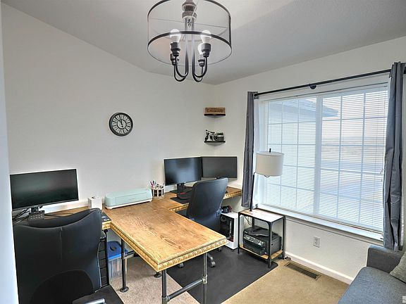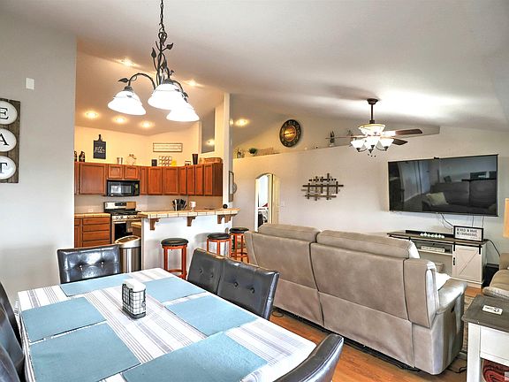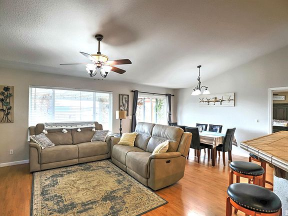 This open and bright floorplan is located on a full acre that has been completely landscaped. This is a 3 bedroom plus an office home. The office and 2 secondary bedrooms with a bathroom are on one side of the home with the primary bedroom on the other side. The family room has large windows and is open to the kitchen and dining room. The backyard has a covered patio, a hot tub that is only a year old, bbq, RV parking, and a storage shed. The home faces an open lot. This home has been well cared for, and upgraded throughout.