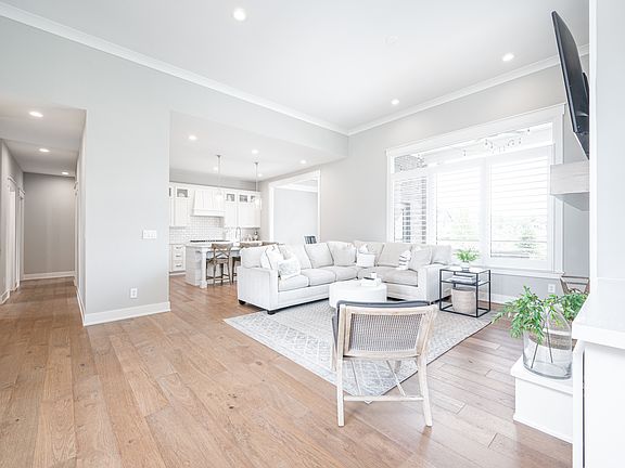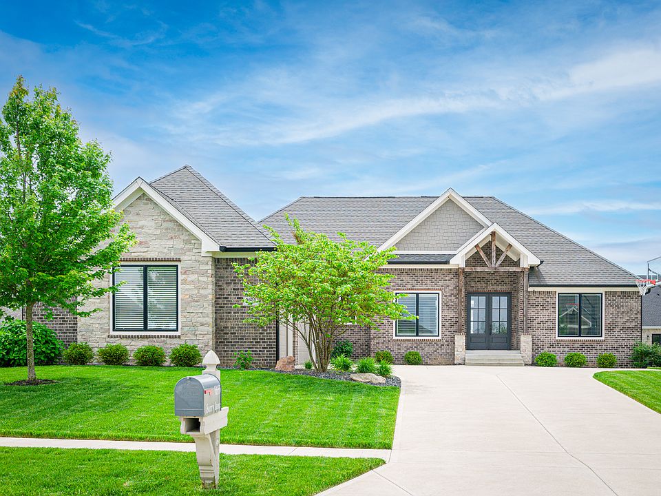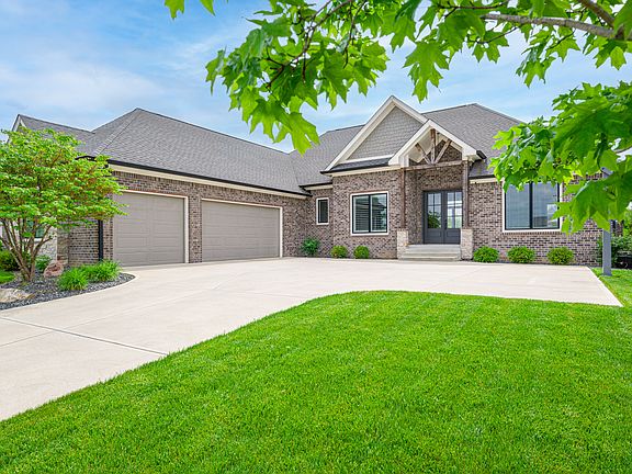 Welcome to your dream home in highly sought-after Calvert Farms. This stunning brick ranch offers a seamless blend of luxury and functionality. Be greeted with serene views of the peaceful pond from the front of the property. Step inside and be immediately taken with a gorgeous foyer open to the main living spaces accentuated with 12' ceilings and hardwood floors. Discover an impressive custom kitchen, adorned with top-of-the-line stainless steel appliances, quartz countertops, a massive one-basin sink and custom, soft-close, Amish cabinetry that provides ample storage space. Enjoy picturesque views from the dining room that is lined with tall windows. The heart of the home is the inviting living room, where custom built-ins surround the gas fireplace. Retreat to the main level primary suite, a true sanctuary boasting a large ensuite bathroom complete with custom Amish cabinetry, a luxurious soaking tub, quartz countertops, and a massive closet providing ample storage for your wardrobe essentials. Don't miss the private office, featuring a stately custom desk built-in, ideal for those who work from home or need a quiet space to focus. The home offers additional well-appointed bedrooms, including a Jack and Jill style setup with individual walk-in closets and a connecting bathroom suite. Downstairs, the expansive basement awaits. A theater room provides the perfect spot for movie nights, while a roughed-in wet bar offers the opportunity to create a custom entertainment space. The basement also includes a large storage area, perfect for storing sports gear and seasonal decor. Step outside to discover your own private oasis, complete with a heated saltwater pool featuring an automatic cover, adjacent to a spacious covered deck, perfect for outdoor entertaining and enjoying the serene surroundings of Calvert Farms. Don't forget about the garage with a Polyurea concrete coating, ensuring durability and easy maintenance. This home has it all, don't miss it.