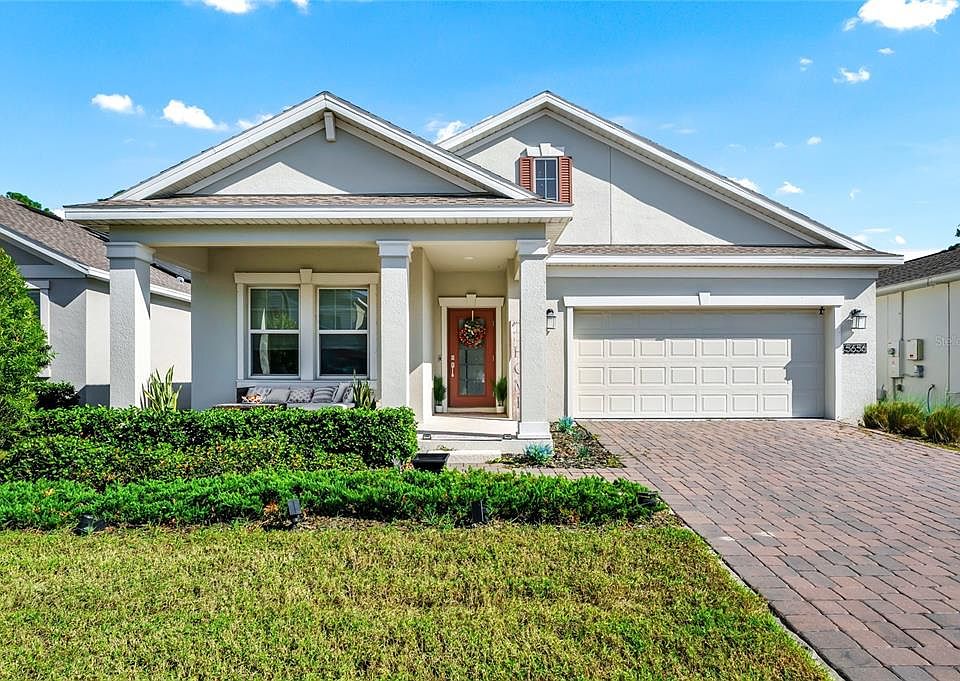 Welcome to Bridgewalk Community, experience the charm and secluded ambiance of this boating community and relish in the ease of reaching Lake Nona's celebrated shopping, dining, and entertainment. Offering a variety of amenities including sports courts, a private boat launch, and more. Welcome to your dream home, this stunning house features 3 spacious bedrooms, 2 luxurious bathrooms, and a 2-car garage. With its open-concept design, the kitchen, café, and gathering room seamlessly flow together, leading to a serene, covered lanai and private backyard, perfect for entertaining or relaxing in privacy. The chef-inspired kitchen is equipped with stainless steel appliances – including a refrigerator, a convenient walk-in pantry, and a large center island ideal for meal prep and socializing. It’s complemented by elegant Coffee Color cabinetry, beautiful quartz countertops, and a charming decorative tile backsplash, with an upgraded sink, faucet, and pendant lighting for added luxury. The private Owner’s Suite includes a large walk-in closet and a spa-like en suite bathroom featuring dual sinks set on a beautiful quartz-topped vanity, a private water closet, and a frameless glass-door walk-in shower. Two additional bedrooms, a second bathroom, and a spacious laundry room are thoughtfully positioned at the front of the home, ensuring ample privacy and space for the whole family. This expansive home is filled with professionally curated design selections, including Coastal exterior finishes and pavers at the driveway. Bathrooms and laundry spaces are accented with stylish ceramic tile, while plush, stain-resistant. This amazing home offers the perfect balance of comfort, style, and functionality – schedule your tour today!