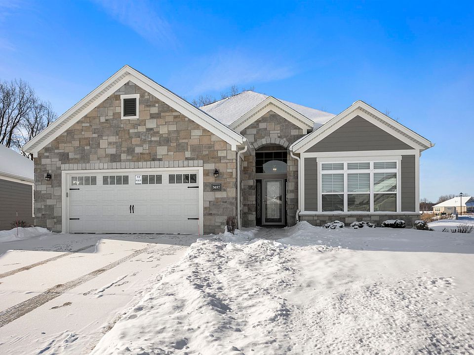 Like new without the construction! Move-in ready Weston design offers no step entry, custom upgrades, & is nestled on a premiere wooded lot in Apple Ridge! Beautiful open concept design featuring a gorgeous kitchen w/granite counters, SS appl pkg, huge WI pantry, large island with seating, dry bar w/bev fridge, and large dinette. Floor to ceiling custom design gas FP anchors LR adjacent to sunroom. The Sunroom leads to a covered porch and patio overlooking the private yard! Luxury primary suite w/ tile shower, huge walk-in closet, & access to laundry. The LL is stubbed for a full bathroom, has large at grade egress windows & is ready for future finishing. Live easy w/HOA services & amenities including lawn care, snow removal & access to clubhouse, fitness, party rm, & outdoor heated pool!