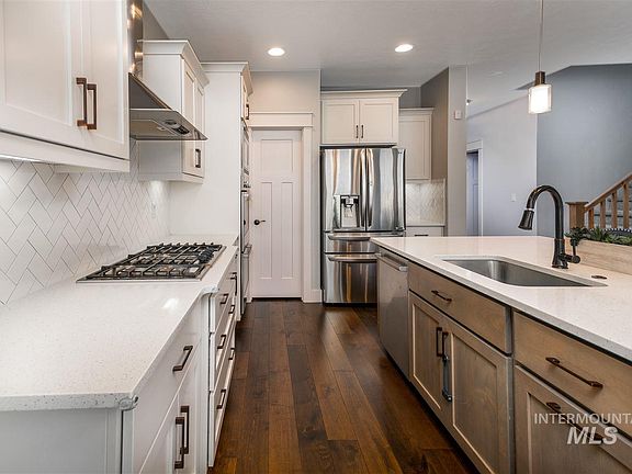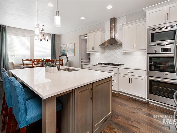 Beautiful, lightly lived in home, in SE Boise. This Berkeley Co. floor plan. Main level features a guest suite, tech room and one additional bedroom. Second level features 2 bedrooms, bathroom, bonus room w/ closet and master suite. Master suite features tray ceilings, soaker tub, tile walk in shower, tile floors, 2 sinks, quartz counters and HUGE walk in closet. Kitchen features SS appliances with double ovens, gas cooktop, large island/breakfast bar with quartz counters & 2 pantries. Mountain views!