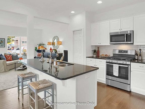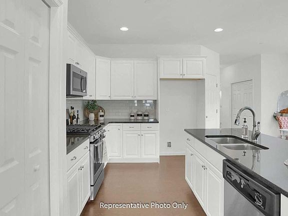 This 2-story end of row townhome includes a 2-car garage.. Attractive vinyl plank flooring in the foyer extends to the kitchen, dining area and family room. The kitchen featuring attractive cabinetry with crown molding, quartz countertops with tile backsplash, and stainless steel appliances opens to the dining area and family room where sliding glass doors provide access to the backyard. The 2nd floor boasts all 3 bedrooms, 2 full bathrooms, and a laundry room. The owner's suite includes a private bathroom with 5' shower and expansive closet. (Floor plan shown is for representative purposes only. Actual floor plan layout may vary. Construction documents take precedence over artwork. See Community Sales Manager for details.) Amenities: Walkout Basement w/10' Ceilings