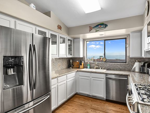 Enjoy dinner with a view in the formal dining area overlooking the water. A stylish kitchen features stone countertops and stainless steel appliances, including a French-door refrigerator and a gas range.