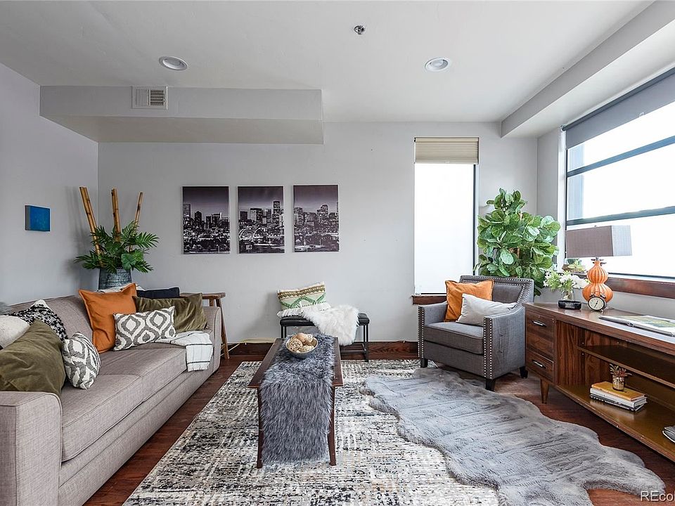 Fabulous 1 bed, 2 bath townhome with ideal flexibility as a residence or live-work space. This two story end unit has southern exposure with skylights to brighten and warm your day. The main level offers a living room, bedroom and refurbished full bathroom accented by beautiful tile. The second level has an open floor plan highlighted by a grand central island with a solid 2" reclaimed oak countertop. The island provides bar seating with ample cabinet and counter space. Enjoy sunrise coffee on your rear balcony and sunset happy hour next to the Heat & Glo fireplace. The building is a mix of commercial and private residences, creating a great environment for a home office or small business. Two deeded parking spaces are included, which could easily be rented for additional income. Located just off I-25 and Hwy 6 for fantastic access in all directions, yet still within the iconic Baker neighborhood and adjacent to the Santa Fe Art District, come discover the possibilities in the heart of Denver!