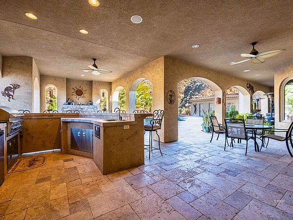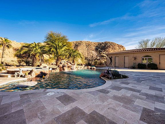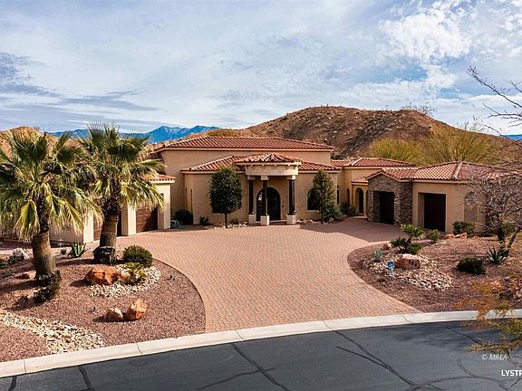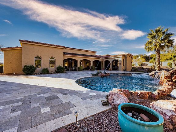 Gorgeous Tuscan home in LaScala a guard gated community. Warm and elegant with many extras and upgraded features. Spacious gourmet kitchen with center island fully equipped for the chef in your life! Iron entry doors are the gateway from the beautiful outdoor landscape to the well appointed entry. Beautifully appointed finishes...Granite countertops, Wolfe gas range, Thermador Refrigerator, GE Mono series appliances, cherry cabinetry, stainless steel sinks, oil rubbed bronze finishes. Floor to ceiling rock wall fireplace is center focus in the Great Room. Stone floors accented with beautiful medallions line the hallways and compliment the hand painted tuscan finish on the walls. Setting on the Oasis Golf course protected by the surrounding Canyons framing gorgeous Swimming Pool/Hot Tub and rock waterfalls giving this large lot and home privacy. Outdoors has huge covered patio, kitchen w/rotisserie/grille/smoker. Outdoor Fireplace. Bar seats 8. ThickTravertine deck accented with lush landscape, paver walkways, astro turf, palm trees and shade trees. Separate Casita onsuite. Four car garage. Membership to Mesquite Vistas Sports Club. Gated community LaScala on the Oasis!