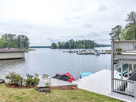 This beautifully updated waterfront home offers 3254 sqft of open-concept living space with breathtaking water views on Lake Harding. The main level features a spacious master suite, a private office, a half bath, and a guest suite. The renovated kitchen boasts stainless steel appliances, solid surface countertops, and a walk-in pantry, flowing seamlessly into a large dining room and a spacious living room with a gas log fireplace and serene water views. A huge screened patio extends from the main living area, providing ample space for entertaining, complete with an outdoor fireplace. Upstairs, two generously sized bedrooms and a full bathroom offer additional comfort. Outside, a two-story double boathouse with a rooftop sunning deck enhances the waterfront lifestyle, making this home the perfect blend of modern updates and lakeside luxury.