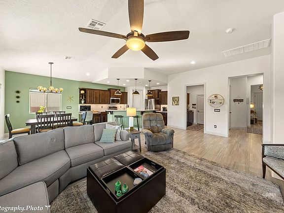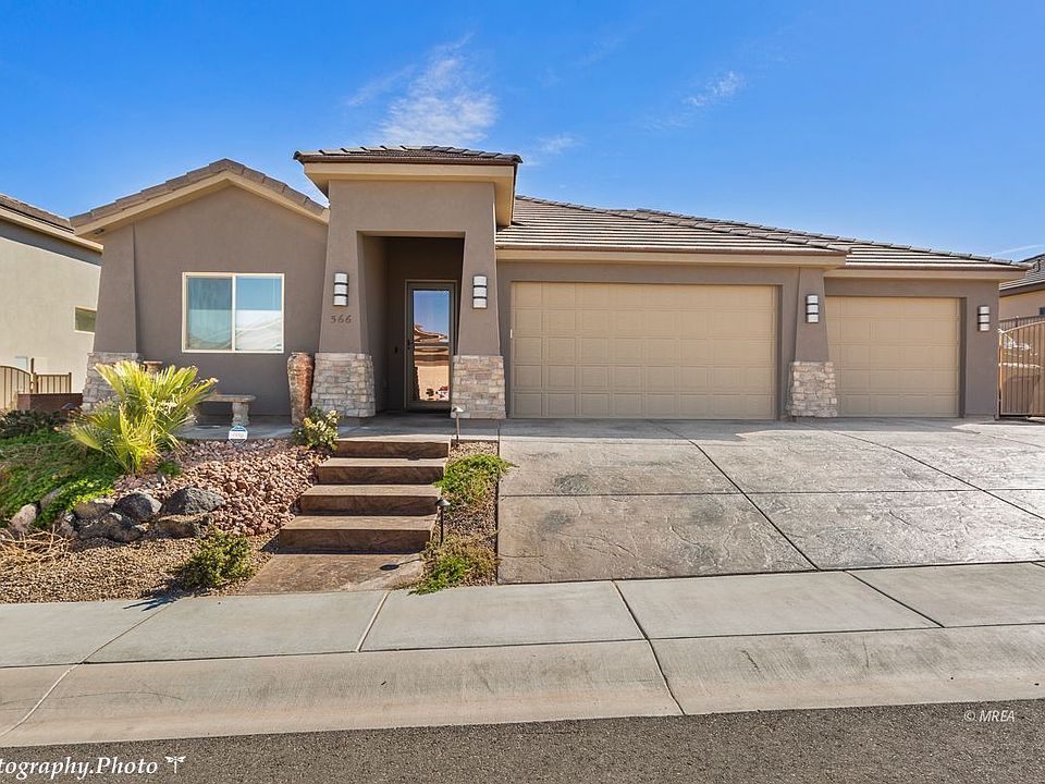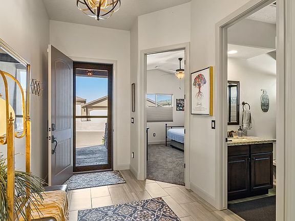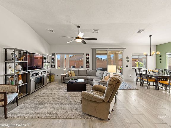 The home is situated on a spacious, fully walled in home site offering awesome views of the surrounding mountains. The outdoor space is incredible with a spacious covered patio, built in BBQ, automatic pull down shade and custom built water feature. The exterior of the home is attractive with substantial rock detail, lush landscaping and a beautiful stamped concrete patio & drive. Double gates for additional low profile vehicles or trailers is appreciated. The upgraded interior won't disappoint. The floor plan is open & desirable. Custom tile runs through out most of the home and warm paint tones, rich cabinetry and attractive finishes add sophistication. Large picture windows frame the incredible backyard from the great room & kitchen. Stainless appliances, including a costly French Door Refrigerator, upgraded induction range, an amazing, oversized walk-in pantry and a custom backsplash are just a few of this homes awesome features. The oversized 4 car garage is almost 1000 square feet w/ an epoxy coated floor offering plenty of space for toys, golf cart and/or additional storage. Water softener, R/O and like new washer & dryer are a bonus.