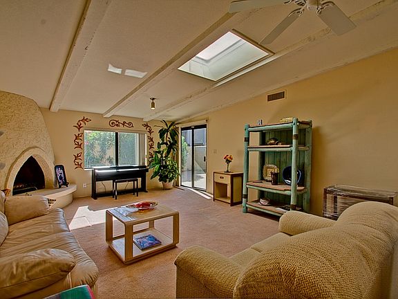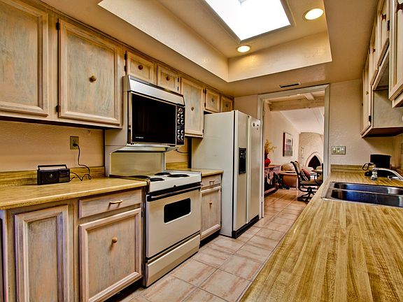 WOW! Wonderful Southwest feel to this charming home. Skylights, wood beam ceiling, beehive fireplace, bright and open floor plan. Tile entry, warm neutral wall colors and carpet make this place easy to decorate with your own style. Kitchen opens to breakfast room with picture windows and ceiling fan. Galley type kitchen boasts plenty of counter space, and white appliances. 3 full baths. One bedroom downstairs and full bath downstairs. Master suite has balcony with mountain views, double sink vanity, spacious walk in closet. Backyard has covered patio and easy to maintain landscape. Don't miss this opportunity to live in the heart of Scottsdale! Closet to Center for the Arts & Down town. This one won't last long!