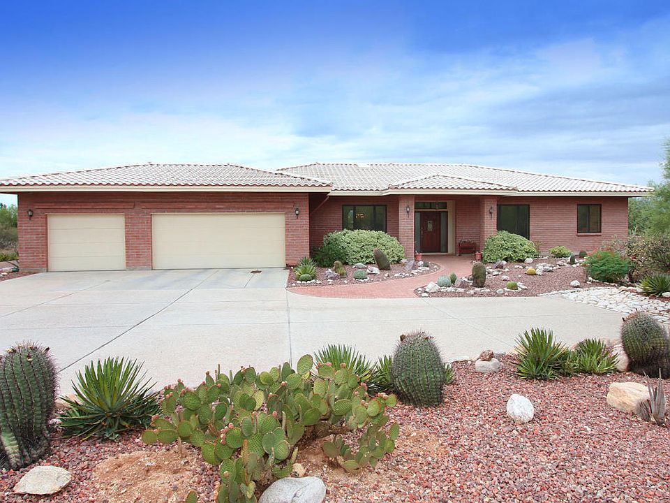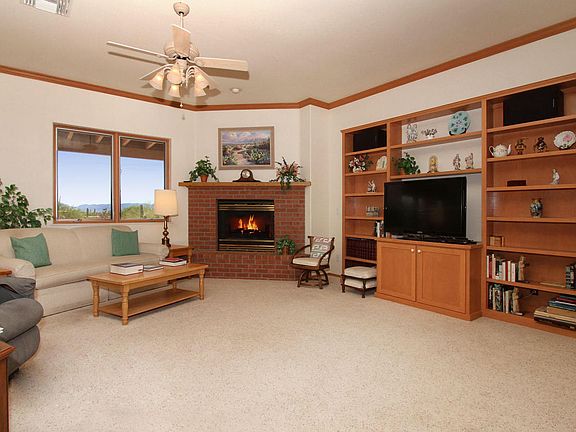 Curb appeal, masonry construction, private cul-de-sac location in the heart of Catalina Foothills. Large, open living spaces filled w/light through the myriad of high-quality Pella casement windows & High ceilings throughout. Large over-sized rooms including the family room featuring a charming brick fireplace. Tons of storage from the wall of glass fronted built-ins in the breakfast area to the walk-in closets in the bedrooms. Centrally located kitchen perfect for being a part of entertaining & every day living. Huge master suite in true split bedroom plan for ultimate privacy & quiet. Oversized 3-car garage w/additional storage, access to the yards plus a work center area. Fruit trees, flowering vegetation & large covered patios & decking all boast tremendous Mtn & City views.
