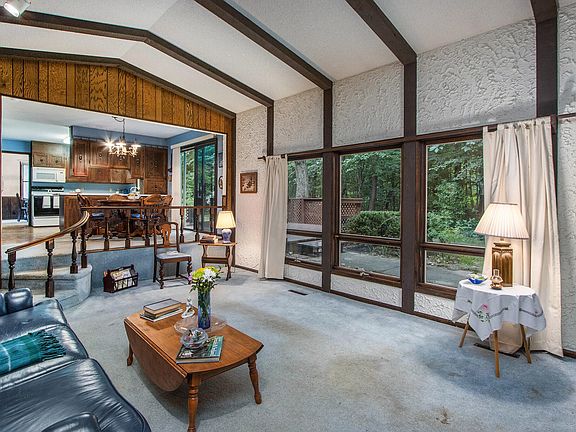 This 4 bedroom, 2.5 bath Tudor 2- story offers inspiring spaces and exceptional amounts of wooded outdoor space. The Great Room features cathedral ceilings, brick wood-burning fireplace, and expansive views into the wooded backyard. The kitchen with it's abundant cabinet and counter space has open sight lines into the sunken Great Room and outside deck area. The formal living room and dining room offer an abundance of natural light and are spacious in size. There are also a guest bath and main floor mud room/ laundry just off the attached garage. The sizeable primary bedroom is complemented by the dual closets, dressing room and 3/4 bath. The 3 other bedrooms on this floor have an abundance of natural light and closet storage space. The basement provides finished space for a rec room and