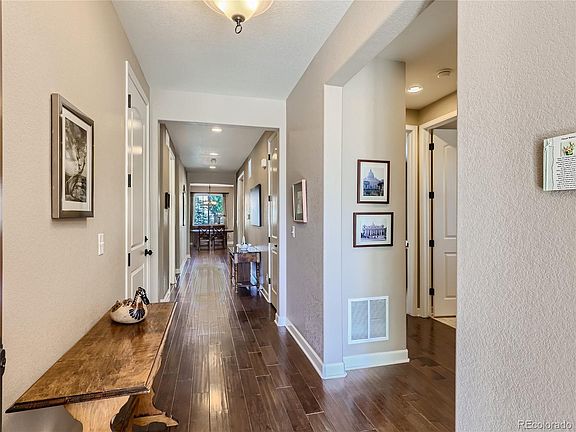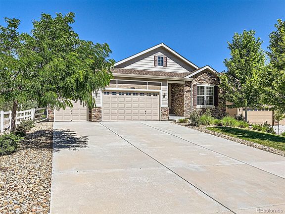 This is a fabulous 3 bedroom, 2 bath home with a den with French doors that sits on a peaceful street in the desirable Crystal Valley Ranch. The home has upgraded finishes including: engineered hardwood flooring, a gourmet kitchen with stainless appliances including a double oven, gas cooktop, large pantry and granite counters. The extended family room has surround sound and a gas fireplace. The primary suite has a nice sized closet and an on-suite bathroom. At the front oft he house there are two additional bedrooms and a full bath. The full, unfinished basement is in pristine condition, has 9-foot ceilings, is pre-plumbed and ready to be transformed. The home is situated on the lot that is open and even provides a glimpse of the neighboring foothills. The deck has an inviting pergola. The three-car garage is drywalled and finished.