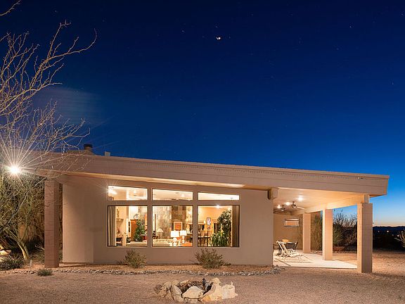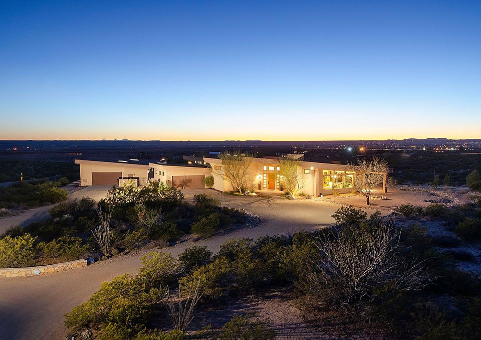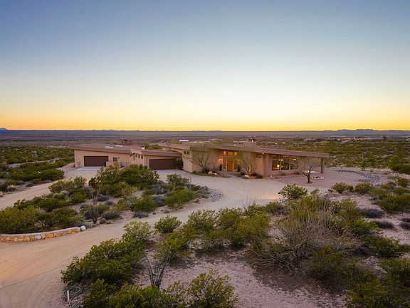 This stunning contemporary home is located on 5 ac in the scenic neighborhood of Las Alturas and is purposefully situated to create 360-degree views of the Organ Mountains and Mesilla Valley. The open floor plan features a large formal living/dining room with beautiful polished concrete floors, a floor to ceiling slate accented fireplace, and breathtaking Organ Mountain views. The spacious kitchen features professional grade appliances, dual sinks, and an abundance of granite counter space. The split floor plan offers 3 bedrooms- each with an ensuite bath. The master features a spacious bedroom with high ceilings and oversized french, along with a separate dressing room with dual walk-in-closets, custom cabinets for storage and double vanity. Off the dressing room is a private bath with a wall hung toilet, separate vanity and a large walk-in shower with natural slate accents. The 2,000 sqft detached workshop includes a 1/2 bath and separate 200 amp electrical service that is ideal for any car enthusiast