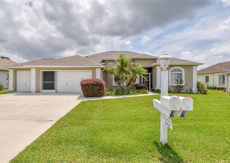 SPECTACULAR GOLF COURSE VIEW OF 17TH FAIRWAY WITH GOLF CART GARAGE. The tile foyer leads to this upgraded house with an open floor plan. The upgraded front door leads to the living room that can accommodate big screen television. The living rooms opens into the upgraded kitchen with stainless steel appliances, clear top r range, lovely cabinets, beautiful Granite countertops with backsplash. This house has lots of cabinets for easy storage. This kitchen has a clear top range, French Door Refrigerator, built in microwave and time saving dishwasher. The Dining or Morning room is located beyond the kitchen for easy conversations. The inside Laundry Room is right off of the kitchen area and has extra cabinets for storage. The Master Bedroom can accommodate a king size bed and plenty of furniture. The walk in closet is an asset. The second bedroom has ample closet space and has a ceiling fan for comfort. The Florida room is for relaxing and enjoying watching the golfers enjoying life, This has has a spectacular view of the 17th Fairway! IDEAL LOCATIONS: Close to Clubhouse, Tennis Courts, Outdoor Olympic Size Pool, Indoor Heated Pool, Tennis, Bocce and Shuffleboard Courts, Library, Ping-Pong, Craft, Pool Table, Exercise Room and much more. GREAT LOCATION: Close to Shopping across the Street at Publix, Walgreens Various Banks, Restaurants, Liquor Store, Gold's Gym, etc. 1 1/2 miles East of the World Equestrian Center. 1 1/2 Hours from Orlando and all the Attractions including Disney World, Universal Studios, Lego Land, Sea World, Epcot, the Airport, etc. 1 1/2 Hours from Both Coasts. All measurements are approximate. Buyer(s) to re-measure.
