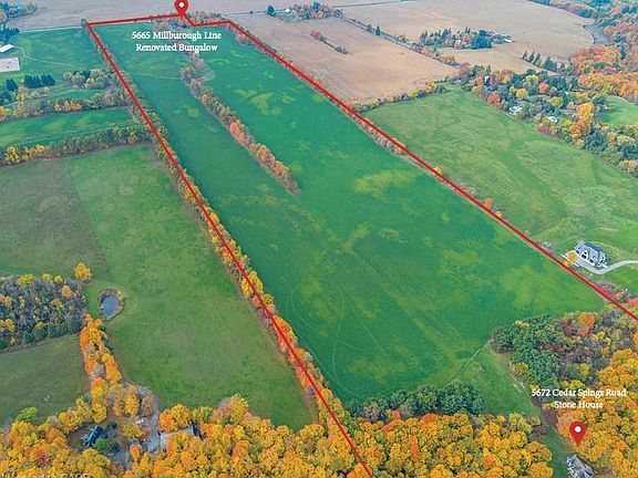 A rare offering in prestigious rural Burlington — just under 100 acres in the highly sought-after Cedar Springs area. Fronting on both Cedar Springs Road and Milburough Line, this remarkable property combines open, level farmland with mature trees and sweeping countryside views. Currently farmed organically, it offers outstanding potential for continued agricultural use, equestrian pursuits, or future estate development. Two distinctive homes add character: a beautifully renovated four-bedroom bungalow over 3100 square feet, blending modern comfort with rural charm (electrical, plumbing all upgraded, furnace all 2021), and a historic 1800s stone house (with new windows and exterior stone carefully pointed and restored in 2021) offering a glimpse into Burlington’s heritage — ideal as a guest residence. With dual frontage providing exceptional versatility, privacy, and accessibility, this property captures the essence of refined country living just minutes from city conveniences. Future development or severance potential. Considerable investment over the past few years was made into clean up the tree line. An incredible estate/legacy property.