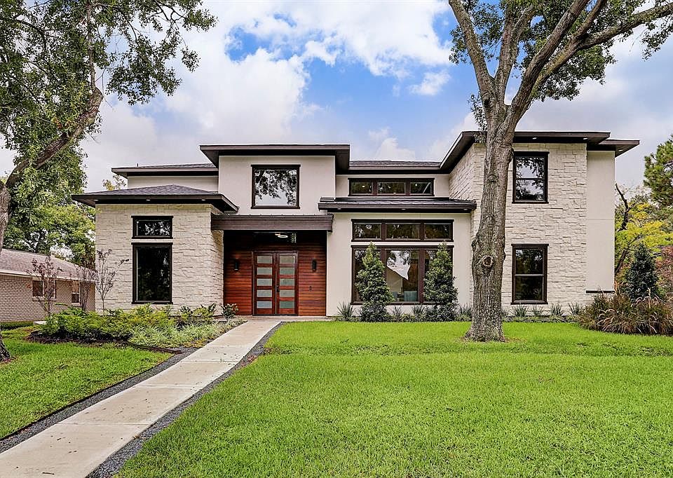 Stunning Modern home with contemporary design and immaculate appointments nestled on a large corner lot in the highly sought after Briarcorft neighborhood. This home offers floor-to-ceiling windows with views of the outdoor kitchen and patio, 7" wide plank hardwood floors throughout, open kitchen with quartzite counters, sleek cabinetry and Wolf and Sub Zero appliances. The master suite includes a lavish bathroom, double entry shower with double shower heads, free standing tub, and custom-designed walk-in closet. The open Floorplan with 21' tall ceilings in entry living, wine room, study, large butler's pantry, secondary bedroom on the first floor with ensuite, media room with wet bar, energy Star Certified, with 100% LED lighting throughout. Large gated motor court, 3 car garage with glass paneled doors perfect for parking or outdoor entertainment.