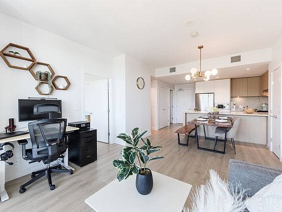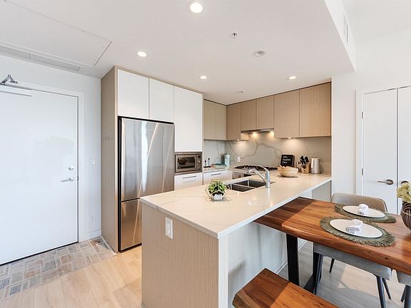 This Stunning home with A/C at 567 Clarke & Como by Marcon offers 2Bed w/DEN and 2 Bath with breathtaking views of the mountains and city skyline. Featuring an open-concept layout, soaring 9-foot ceilings w/a spacious balcony perfect for relaxing or entertaining. The gourmet kitchen is equipped with premium Bosch gas cooktop, Fisher & Paykel refrigerator and elegant quartz countertops ideal for the modern chef. Enjoy resort-style amenities including a fully equipped gym, yoga room, table tennis area, indoor sports court, sauna, karaoke room, and two guest suites. Situated just steps from Burquitlam SkyTrain Station and only minutes away from popular restaurants, cafes, grocery stores. 2 PARKINGS & 1 LOCKER included!