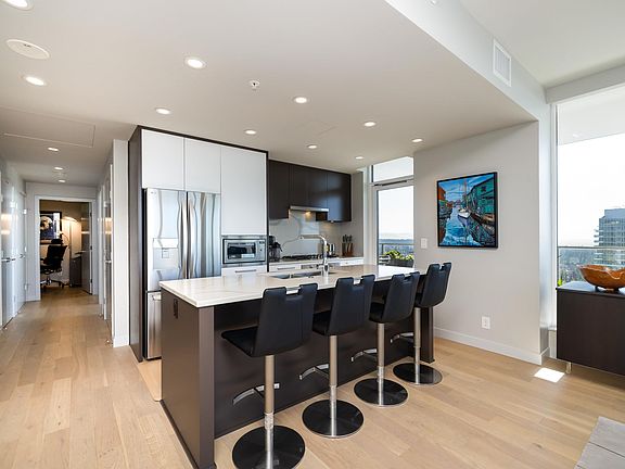 Marcon Built "Clarke & Como". Enjoy a luxury lifestyle in this contemporary 1101 sqft sub-penthouse with towering 270 degree views that include Burrard Inlet, Mount Baker, City, and SFU Hill. Double sliding doors for inside/outside living to an oversize 505sqft wrap around balcony. This stunning 2 bedroom, 2 bathroom, plus den residence has well over $100K in upgrades. 2 side-by-side parking with EV, 3 lockers (one is a 12'x12' room with power). Outstanding amenities include rooftop lounge/party room, gym, yoga studio, sauna, indoor basketball court, sauna, karaoke room, guest suites. Steps from Skytrain, shopping, and restaurants.