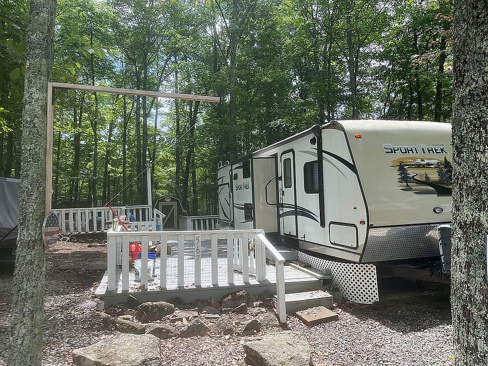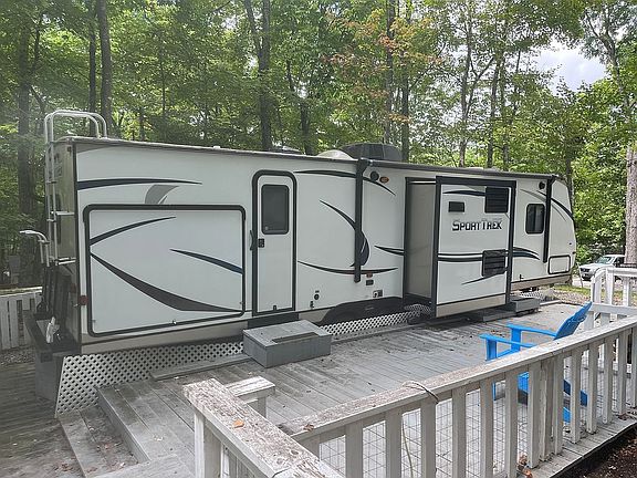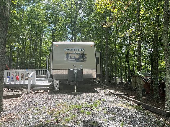 Located within the gated GreenStreet Mountain Campground (see FB web link for amenities). The price includes the lot, camper and golf cart. HOA dues PAID through July 2025. Camper features a bunkhouse in the back with the master in front. Outdoors there is a tri-level deck to maximize outdoor living. Golf cart runs on gas and seats 4 adults. Call or text for more information 989-295-2757