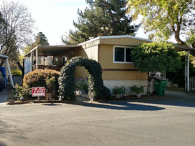 Welcome to easy living at Almond Grove Senior Park. This shaded manufactured home sits in the back corner of the park with no backyard neighbor! Create your favorite meals in the open concept kitchen featuring tile counters & a stainless steel fridge. Sit with your tea or coffee on the patio to enjoy the many birds & squirrels playing in the trees. The home also includes a fenced yard and a 8x12 shed. When you're ready for a swim, head down to the community pool and cool off! If interacting with others is more your style, you can choose the rec room where they play bunco & hold potlucks monthly. The community has a park which is guarded by security to help residents feel safe. Laundry is conveniently located inside the home. Recent upgrades include a new roof, dual pane windows, HVAC system, & new doors. Don't miss this home close to walking trails and shopping! Call your favorite agent today.