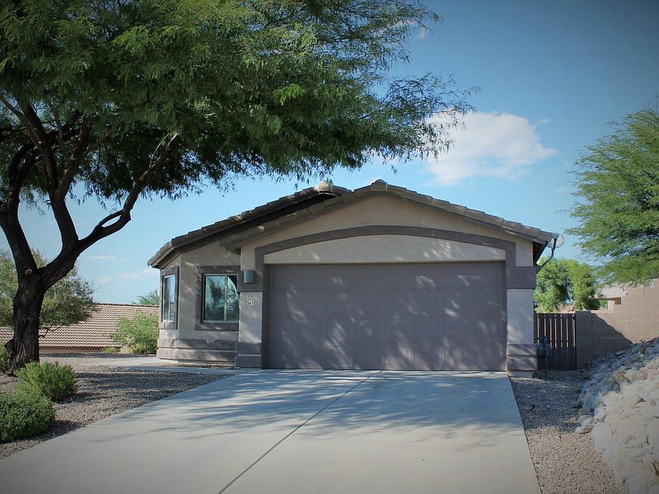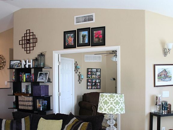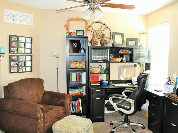 Beautiful elevated lot! Vaulted ceilings and split floor plan. Executive height master bath, double vanity w/shower and garden tub. 4th bedroom is currently an office w/double door to great room. Covered patio- mountain top views-lush back yard w/spa pad. Irrigation for grassy beautiful lawn. Fully landscaped. Long driveway for additional parking with large canopy tree shading the front yard! All appliances included with this home. Richmond American built with earth tone colors and lots of builder upgrades.