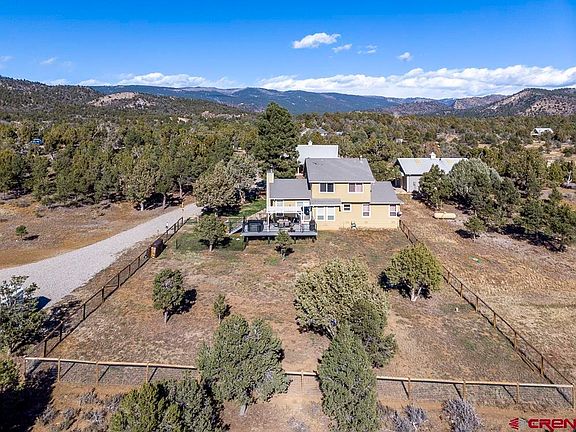 Preinspected! Dreamy 15 acre horse property just 10 minutes to town! This adorable 3 bedroom farmhouse features 2 separate living areas, primary suite on the main level, huge fenced yard, brand new trex deck, roof, and furnace. 1,080 square foot heated Morton shop with covered wraparound porch is currently used for the ultimate rec room but could also be great for a car collector, artist, home business, etc. Very versatile space! Oversized detached 2 car garage has built in work benches and storage shelves. Darling 2 stall barn can hold 300 bales of hay. South facing stalls open to a dry lot with sand footing which opens to the rest of the fenced property. Adjacent tack shed (new) to keep all your gear clean, organized, and dust free. Meticulously maintained inside and out, pride of ownership is aparent in every square inch of this property. Beautiful panoramic views, stunning sunsets and sunrises, and plenty of elbow room on this unique Durango property. Be sure to look at the Matterport 3D tour!