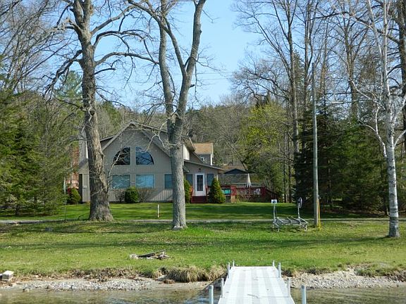 Lakefront living without the lakefront cost! Incredible views of Hubbard Lake. Your lake access is right across the street. Newer dock is included and already in the water, ready to enjoy. Imagine spending your summers in this combination of rustic and absolutely charming home, located at the South End of Hubbard Lake. This 2,664 square foot home offers 3 bedrooms, 2 baths, and a bonus, 24 by 14, finished room above the garage. Main floor features: open kitchen, living & dining room. Knotty pine walls & cathedral ceiling. Floor to ceiling lakeside windows and split stone wood burning fireplace. Hardwood floors throughout. 14 by 15 master bedroom, full bath, laundry room. Cozy 10 by 15 den that enters to wrap around deck. At the top of the beautiful wood stairway you will see the open loft and beautiful lake views. 2 large bedrooms, 15 foot vaulted ceilings, full bath, and the bonus room above the garage. This home is close to the water and nestled on three lots. Savor the views, sunsets, breeze, and sounds of the lake from the wrap around deck that gives you plenty of room for all the outdoor furniture and the bbq grill. Such a unique and fun floor plan for families. This home has enough room for the entire family, and the friends that will want to come and visit your new family lake-house. Natural Gas Forced air furnace and Central Air. 6 panel, wood doors throughout. Plenty of storage available. This home has so much to offer, it's truly something you will want to see in person. There is also an additional, detached, 1 car workshop is large enough to store a personal watercraft or small boat. Please call for a personal showing. A truly unique and rare property in an attractive neighborhood popular with both vacation and year round home owners! Very close to the White Pine National Golf course, party store and restaurants.