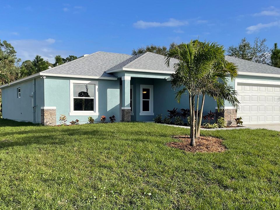 Established neighborhood, but this one is BRAND NEW CONSTRUCTION and it is BEAUTIFUL! Still a couple wooded lots adjoining providing privacy, but a nicely kept street. Quartz counters, wood look TILE with carpet in the bedrooms, super sized walk -in closet for the primary bedroom, fans in all bedrooms, living area & rear ''trussed'' porch! This one comes with double insulated, energy efficient windows, hurricane shutters, a garage door opener and a 1 year warranty! Approximately 22 minute drive to the Beach & only 1 hour to the Orlando Airport. Palm Bay feels like a small town while offering the benefits like a small city with many restaurants, parks, movies & malls! Can't wait for you to see it!