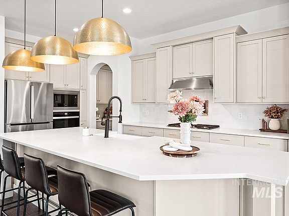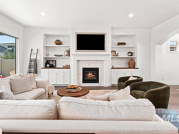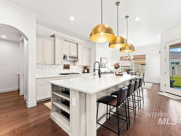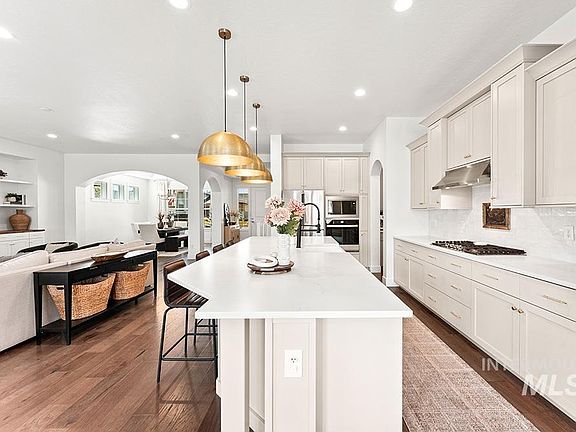 Immaculate home with rare 43’ RV garage! Thoughtfully customized beyond builder standards, this bright, stylish retreat is perfect for recharging between Idaho adventures. Elevated design features include tall ceilings, luxury engineered hardwood flooring, tray ceilings, arched doorways & new transitional lighting. The open great room centers around a stunning kitchen with honed quartz counters & elegant cabinetry. Enjoy formal & casual dining, ideal for living & entertaining. The 3-panel slider opens to a beautifully landscaped backyard with covered patio. The main-level primary suite includes a spa-like bath & walk-in closet with laundry access. 3 bedrooms, 2 full baths, & bonus room (potential 5th bedroom) are set privately upstairs. Additional office/flex space on the main. The oversized RV garage offers 30-amp power, a dump station, & built-in storage—ideal for outdoor enthusiasts. Fabulous neighborhood amenities include pool, playground, fishing pond, sports courts & fields. A refined & rare offering!