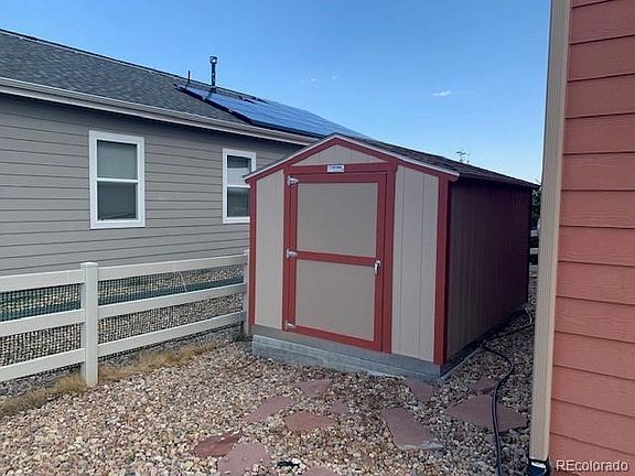 Deal fell for buyer's financing. Back on the market-4 years new! Beautiful 2 story home, all kitchen appliances are included. Kitchen has upgraded cabinets, slab granite, and kitchen island. Roof has just been replaced, 30 year shingles. Quiet location across from open space, with a park nearby. Main floor extras include a study and mud room. Second story has 4 bedrooms, and 2 full bathrooms, and laundry room with additional shelves for storage. Flex space at the top of the stairs has room for a desk or reading area. Master bedroom with mountain views and 5 piece bathroom. Huge walk-in closet off of master. ADT alarm system. Every bedroom has a ceiling fan, as well as living room. Huge crawl space for additional storage. Nice fenced back yard with concrete patio, and matching shed. Quick and easy access to I-25.