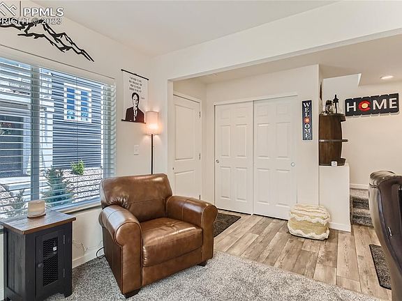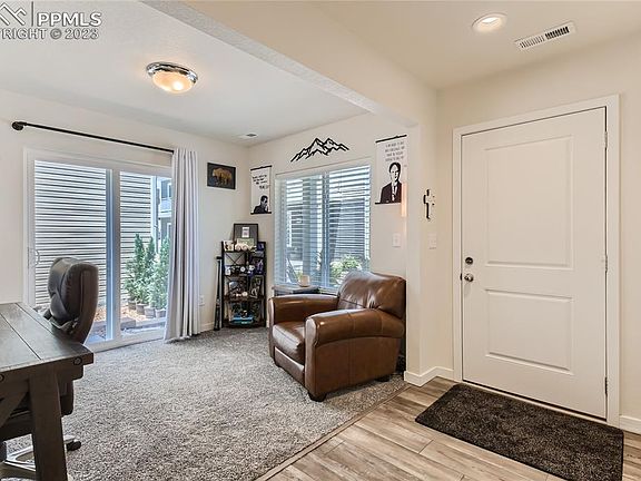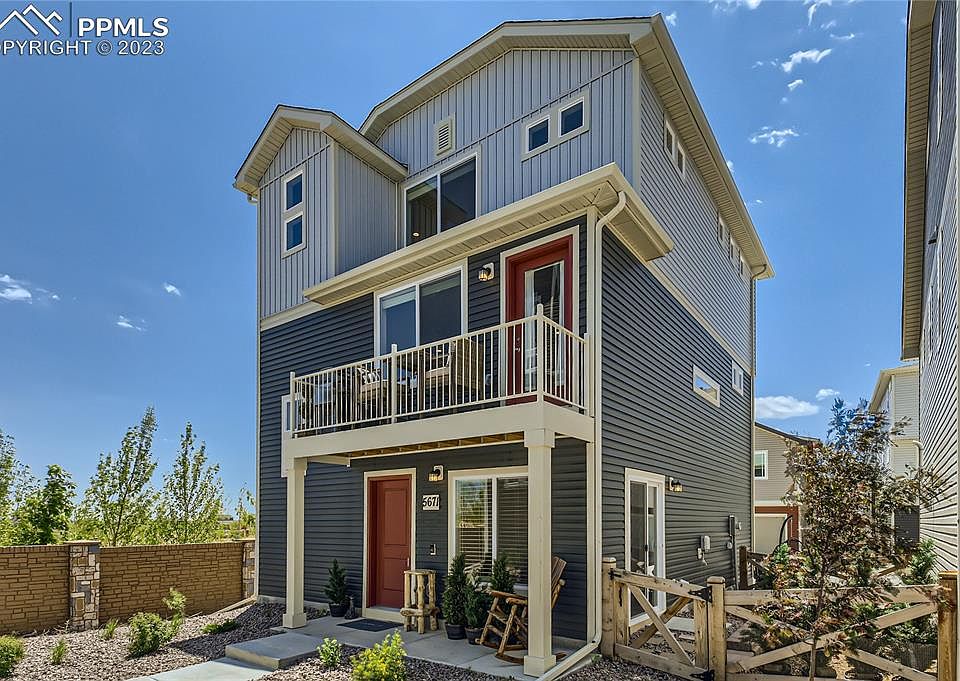 Beautiful like new 1766 sq ft 3-story that shows like a model in the highly sought after Banning Lewis Ranch community. This 2 year old upscale low-maintenance home boasts 3 levels of versatile space and has 3 beds, 2 baths, and a 2-car garage. MAIN LEVEL: Front door and garage enters into a flex space that can used as an office, den, or workout area that opens out to a fenced side yard. 2ND LEVEL: Open great room with LVP flooring, barn wood accent wall and walk out to a composite balcony. Beautiful kitchen with stainless steel appliances (including gas range), upgraded cabinetry, granite counters, and LVP flooring. Full bath with granite counters, LVP flooring, and tiled shower/tub. 2 beds. 3RD LEVEL: The master suite features a spacious bedroom with an attached full bath. The master bath has granite counters, a tiled free-standing shower, LVP, and a walk-in closet. A Nice sized loft that has endless possibilities (could be used as a nursery, an office, a workout space, or a second living room). Laundry closet. OTHER FEATURES: Immaculately maintained and move-in ready. Better than new and loaded with upgrades. All appliances included with full-sized stacked washer and dryer. All the furniture is brand new and most of it is for sale. New custom blinds throughout. A/C. Brand new whole house humidifier. Oversized 2-car garage. Covered front porch. Balcony. Fenced side yard. Maintenance free landscaping. HOA to ensure a carefree lifestyle that takes care of the front yard landscaping, snow and trash removal, and access the community amenities. COMMUNITY: Banning Lewis Ranch offers great community events, a club house, a gym, pools, water parks, parks and playgrounds, pickle ball courts, a dog park, walking trails, and more. Award winning K-12 Banning Lewis Ranch Academy. Close to shopping, dining, entertainment, schools, parks, and military bases. Please look at floor plans on pictures and virtual tour.