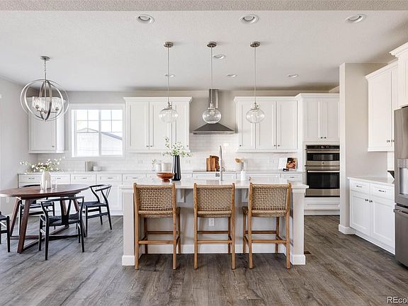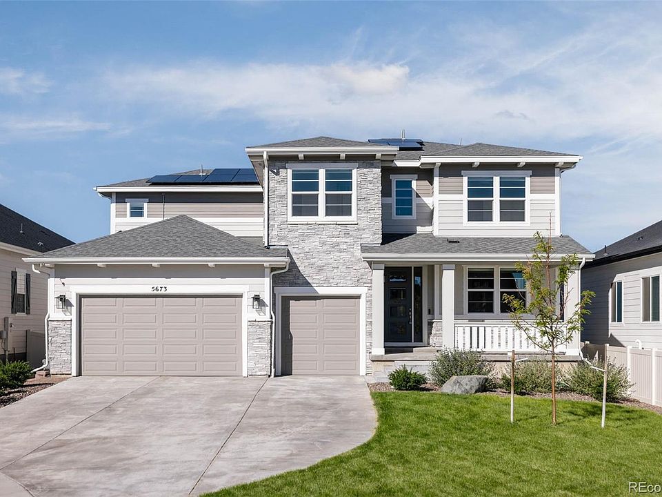 Thoughtfully designed home in Stone Creek Ranch community, nestled in a quiet cul-de-sac and backing to scenic open space. Step inside to discover a light-filled, airy space - to your right a large formal dining area awaits. Continuing beyond to discover the expansive, open-concept living area is ideal for gatherings. The living room is a true showstopper, boasting soaring two-story ceilings. This space, along with the rest of the main floor, is lined with luxury plank vinyl flooring, adding a modern touch. The beautifully designed kitchen features stainless steel appliances including an induction cooktop, abundant white cabinetry, quartz countertops, a large center island & a spacious pantry to keep you organized. Just beyond, the eat-in dining area opens to a backyard oasis, perfect for entertaining or quiet evenings outdoors. Step outside to your covered patio, featuring retractable shades, where you can enjoy the beautifully landscaped backyard overlooking the lush green space. Push open the French doors to reveal the private office perfect for working from home. The mudroom leads to a 3-car garage, with a Level 2 electric vehicle charger. Head upstairs, where plush carpet guides you to the luxurious primary suite. Here, you’ll find coffered ceilings, abundant natural light, and a spa-like five-piece ensuite with double vanities, a soaking tub, a glass-encased shower, & a walk-in closet. Three additional sunlit bedrooms with ample closet space, and two secondary bathrooms complete this level, offering convenience and comfort for everyone. The finished basement includes a large second living room, an additional bed and bath creating the perfect space for overnight guests or just more space for your needs. There’s also plenty of storage space on this level. This home also includes a owned solar system designed to offset nearly all the home’s energy usage, a whole-house water softener & purifying system, and easy access to the Cherry Creek Trail, just steps away.